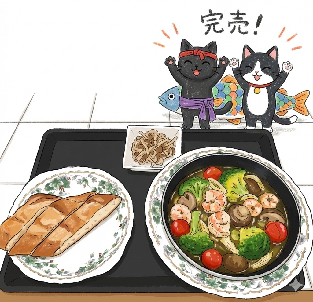 本日の日替わりの軽食は、「エビと野菜のアヒージョ(ガーリック風味), パン付き」です。 暖かな日差しに包…