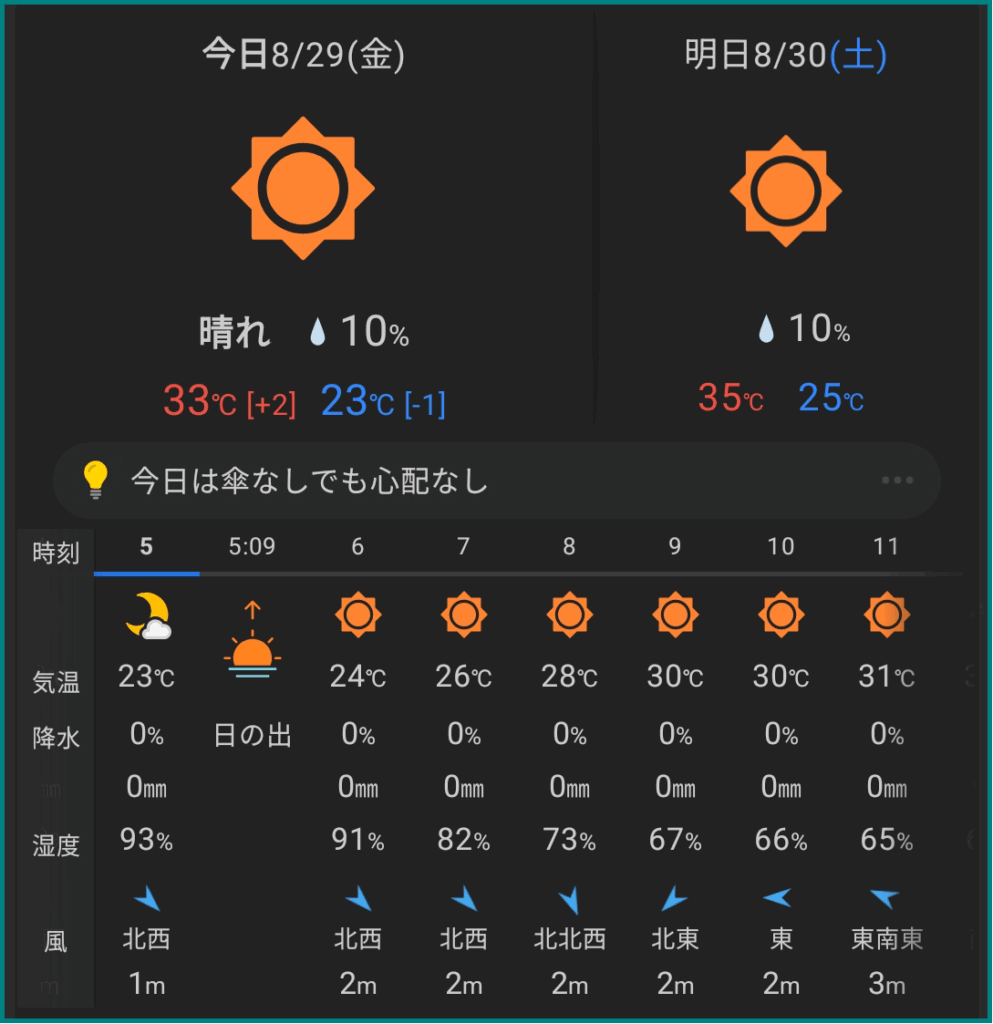 昨日は最高気温が下がったことで、今朝の気温は23℃、ほんのりとした涼しさに包まれました。最低気温が下がると、早朝に蚊に悩まされなくなるのも嬉しいことですね。ただ、それも束の間で、9月上旬はまた蒸し暑い朝が続きそうです。