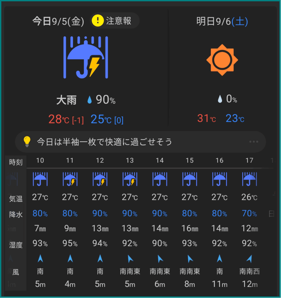 ところが昨日の予報から一転、今日は午前9時から午後5時にかけて大雨のマークがずらりと並び、さらに南からの風が5m/sで吹くとのこと。どうやら日中は荒れ模様の天気となりそうです。