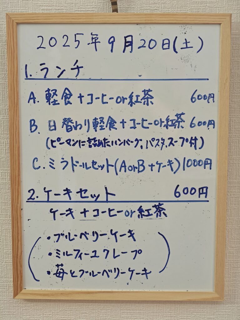 好評の新メニュー「ミラドール・セット」は、日替わり軽食(スリランカ風スパイスカレーなどの軽食もOK)+ケーキ+コーヒーまたは紅茶で1,000円です。