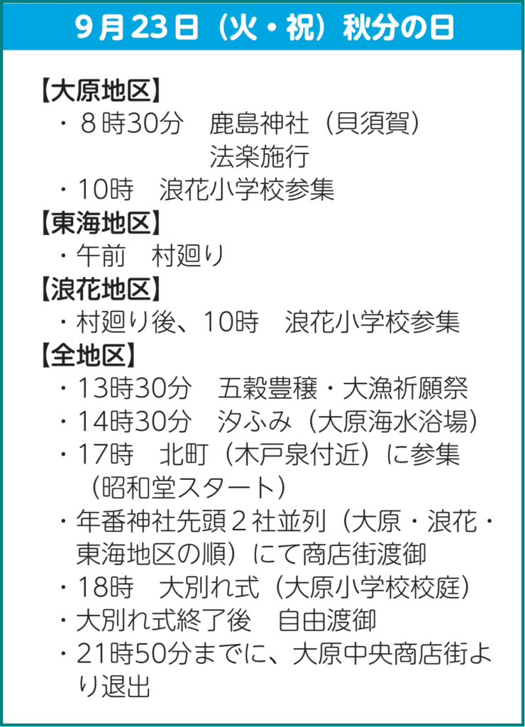 HOMEその他 [2025-09-23] 大原はか祭り 2025-09-23 その他 地元の人びとが心待ちにしてきた「大原はだか祭り」が、いよいよ幕を開けます。勇壮な神輿と掛け声に彩られる一日は、街の空気そのものを包み込むようです。23日の大まかな日程は、次の通りです。 [2025-09-22] 大原はだか祭り [2025-09-23] 大原はだか祭り (1日目)