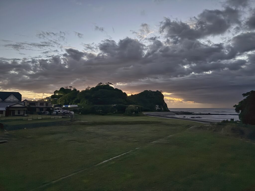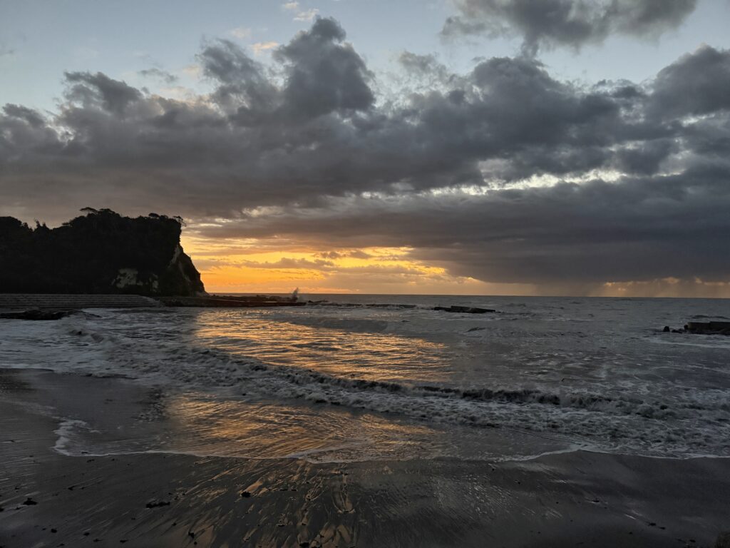 大原はだか祭り、二日目の早朝です。北風が吹きつけ、波も高いものの、二日とも晴れ渡るのは稀なことです。ミラドールから望む小浜八幡神社では、昼過ぎまで「村廻り」が続き、お神輿がミラドールの前を通り抜けていきます。村廻りとは、神様を氏子それぞれの家へお届けする大切な役割を持つ行事です。
