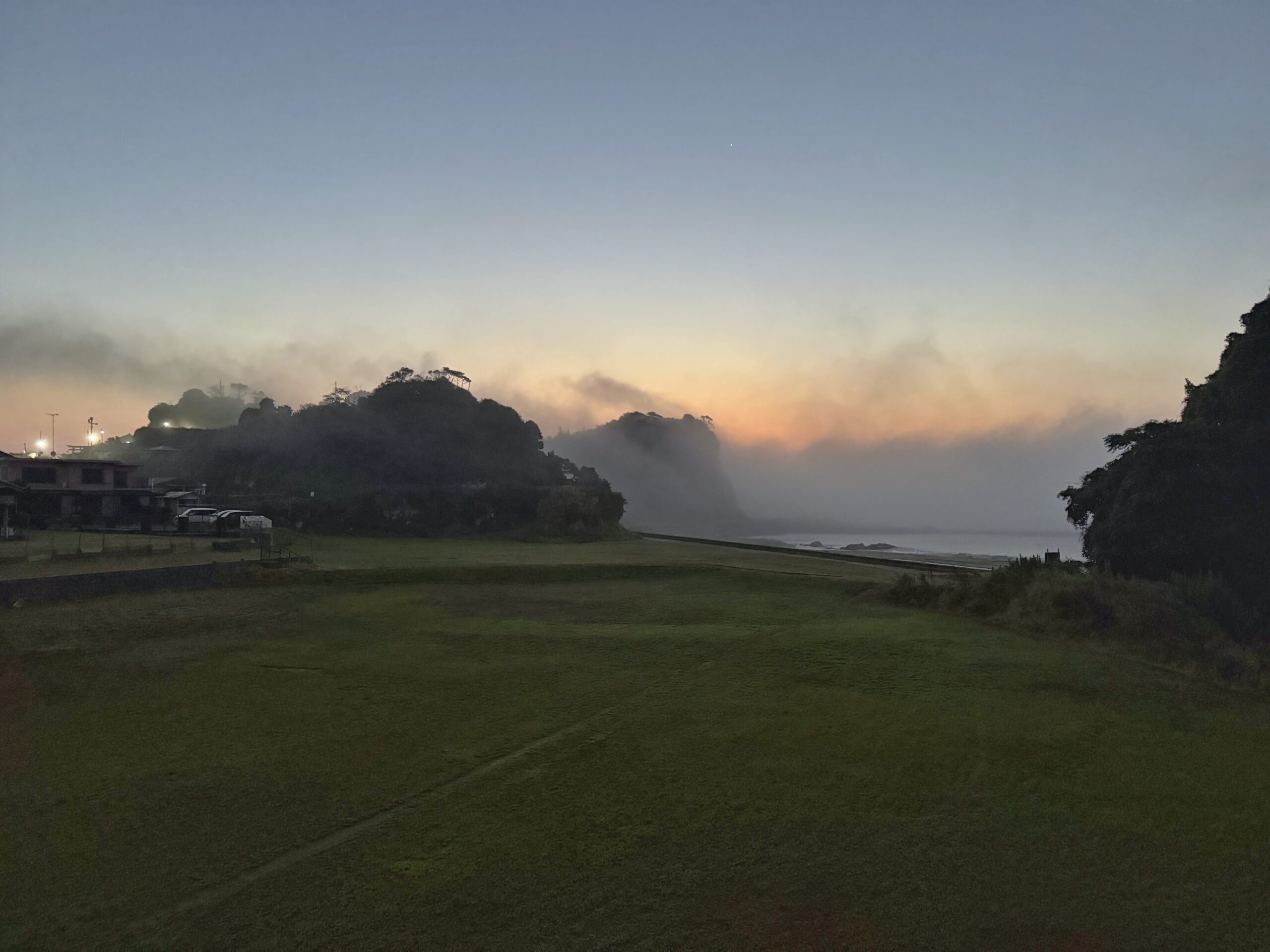 今朝の気温も25℃。薄い雲とモヤに覆われて太東崎の姿は見えませんが、灯台の灯りと、ほぼ満月に近い月の光…