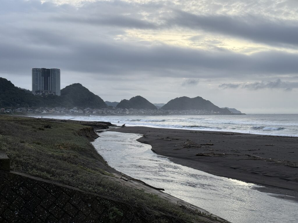 安房鴨川の今朝の気温は15℃。雲の切れ間からわずかに青空がのぞくものの、時おり小雨が浜辺を濡らしています。