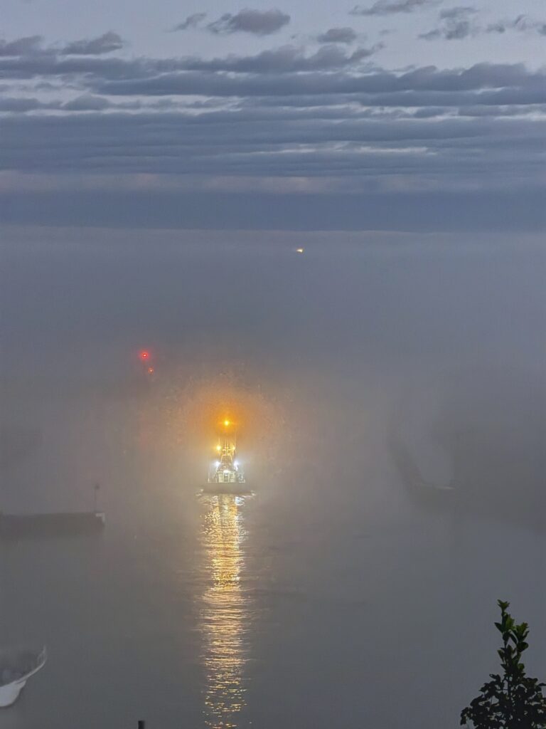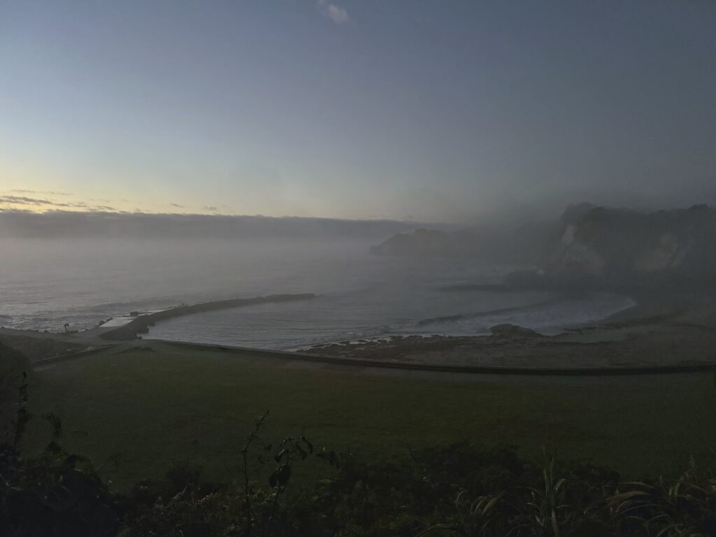今朝の気温は15℃。気温がやや高めで湿度もほぼ100%、午前4時頃から濃い霧に包まれました。太東埼灯台の灯りはもちろん、港の先端にある小さな灯台の灯りまでもが、霧の向こうに消えていきました。けれど午前5時を過ぎる頃には湿度も下がり、かすかに太東埼灯台の灯りが戻ってきました。