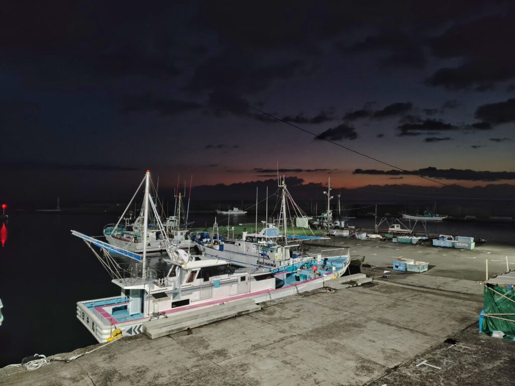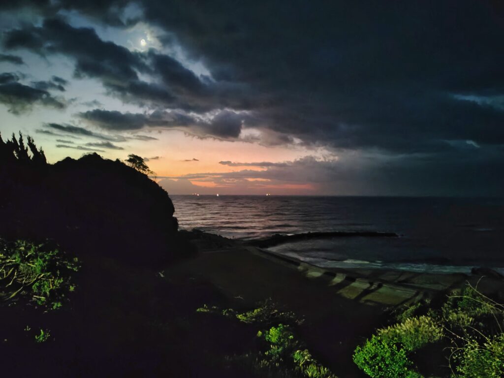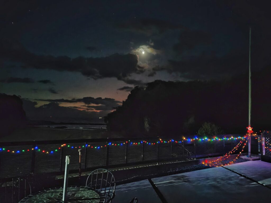 今朝の気温は11℃。このところ曇り空が続き、夜明け前の景色を楽しむことができませんでしたが、今日は日の出の一時間ほど前、雲の切れ間から薄く朝焼けがにじみ、海に面した空が静かに色づきました。テラスの灯りがその暗さをそっと和らげ、夜と朝の境目がゆっくり溶けていくようなひとときでした。