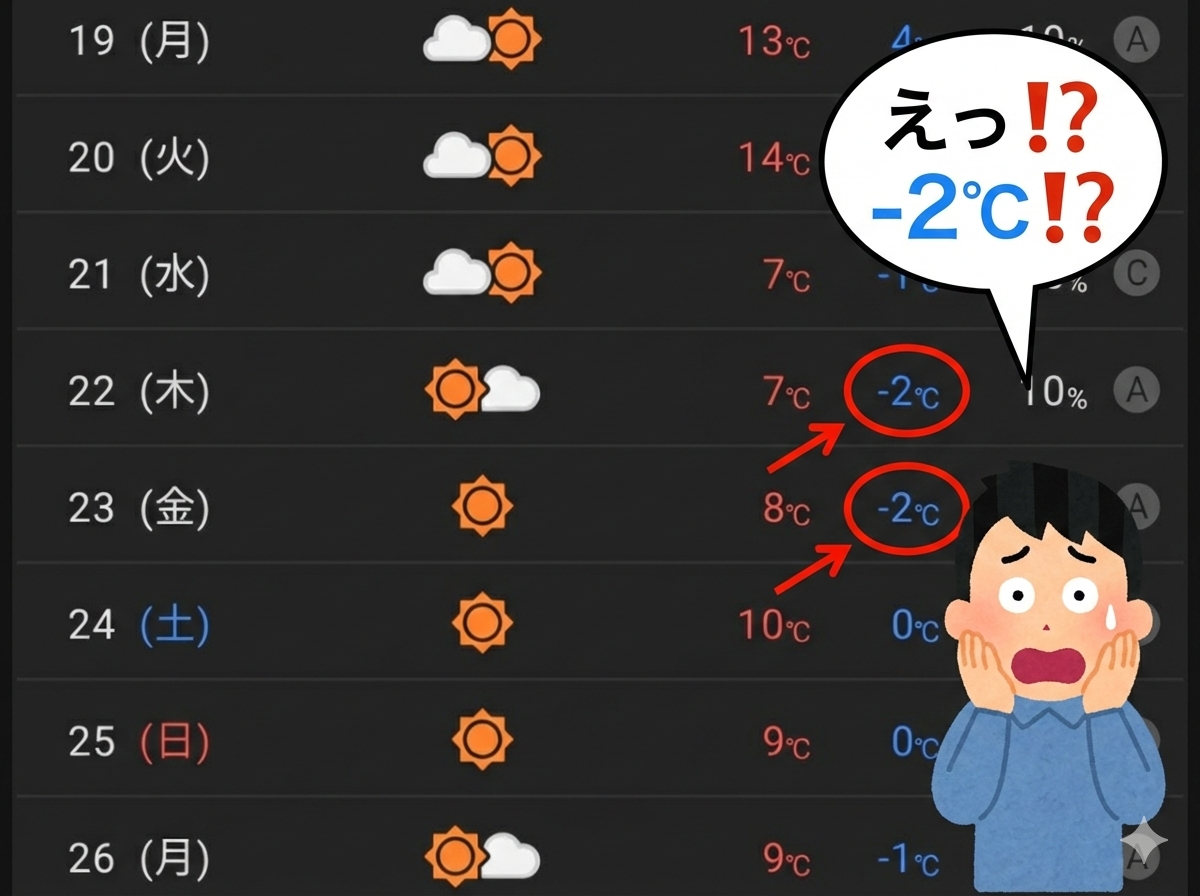 今朝の気温は3℃。強い風も収まり、早朝の空気は穏やかさを取り戻しています。2週間予報に目を向けると、最低気温が0℃やマイナス1℃の日が幾つも並び、季節はいよいよ寒さの本番へと歩みを進めているようです。
