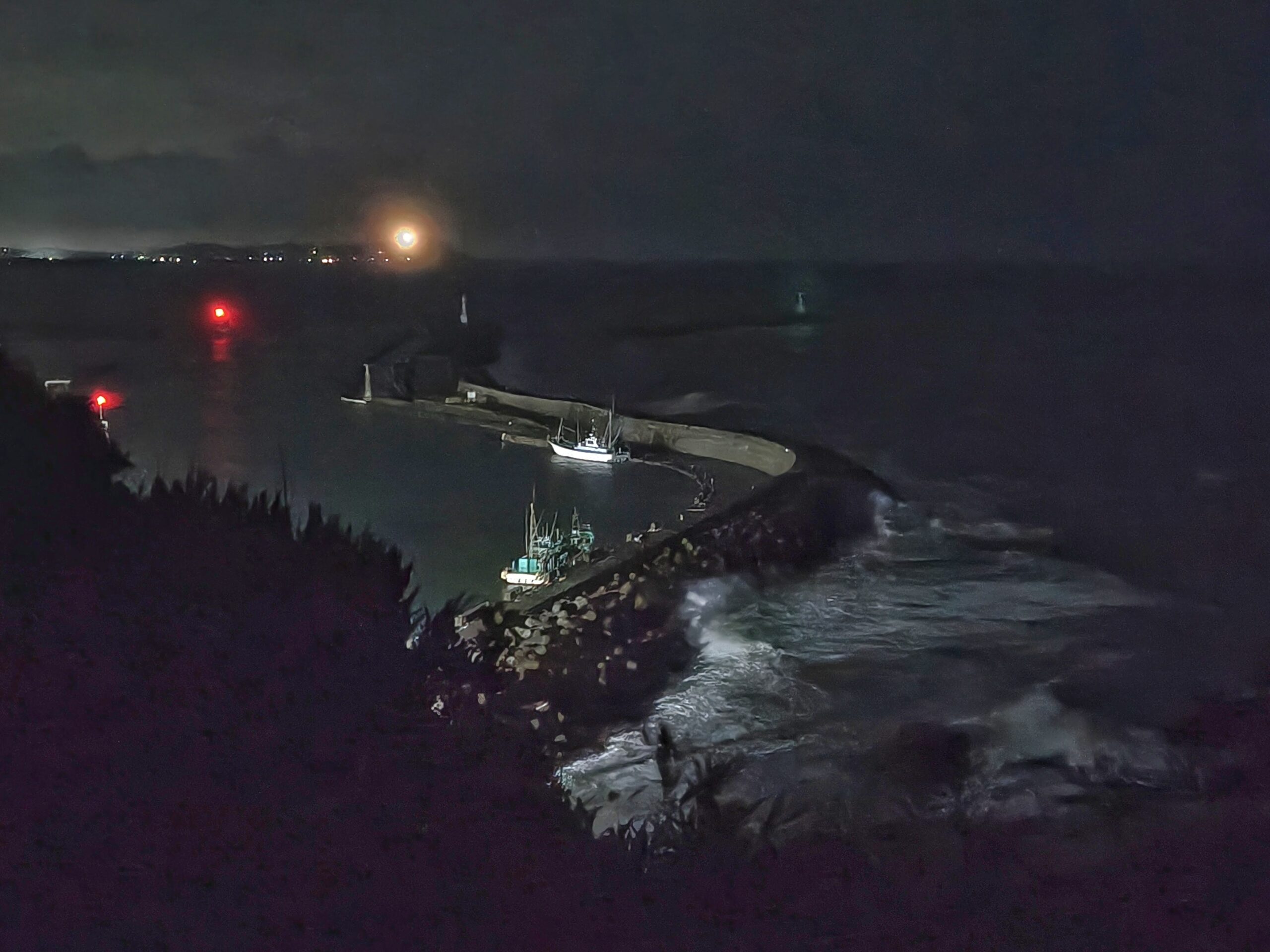 今朝の気温は12℃。まだ夜の名残を残す空の下、沖にはいくつもの船の灯りが揺れています。波の音が遠くから…